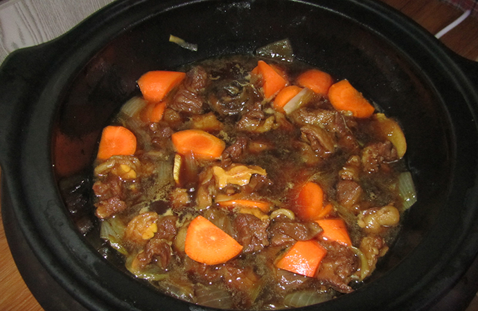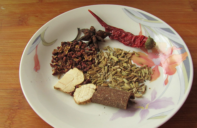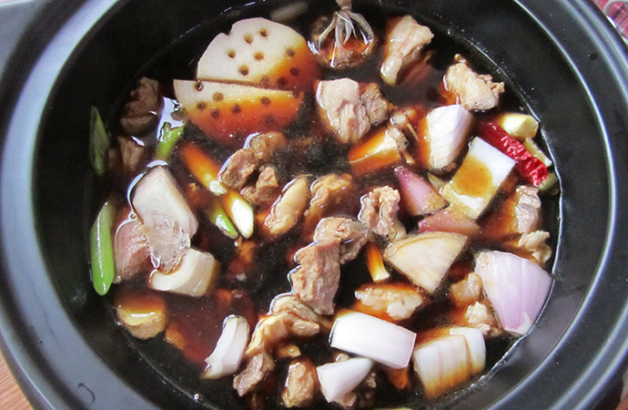 【配料】:料酒2湯匙、老抽2湯匙、生抽1湯匙、陳醋1湯匙、冰糖1湯匙、蔥、姜、大蒜少許、鹽、清水適量、八角、茴香、桂皮、香葉、干辣椒、花椒少許、青蒜葉少許