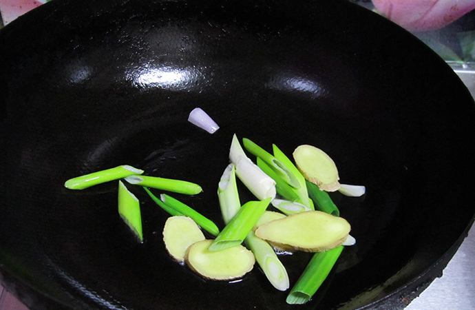 4、鍋內放少量油燒熱,爆香干辣椒與蔥姜蒜
