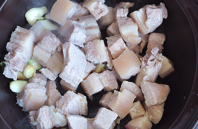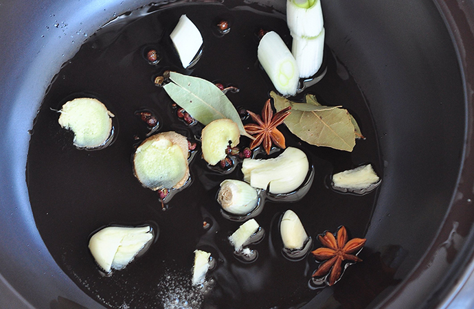 【配料】:生姜3片、大蒜3瓣、大蔥1根、八角1顆、食用油2湯匙、料酒2湯匙、生抽2湯匙、老抽1湯匙、冰糖、桂皮少許、鹽、清水適量