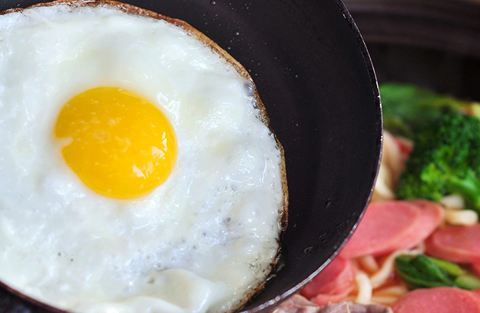 6、用煎鍋將雞蛋煎熟,將蔬菜擺在面條上面