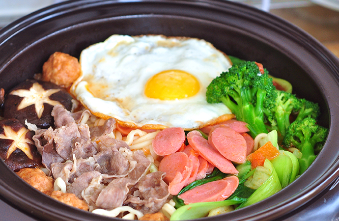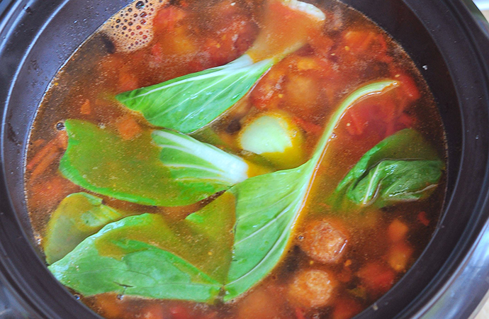 【主料】:西紅柿150克、小油菜6克、香菇5克、西蘭花10克、香腸50克、肉丸100克、肥牛20克、雞蛋50克、面條200克