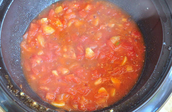 2、西紅柿切小塊放入,蓋上鍋蓋燉煮至西紅柿變軟爛
