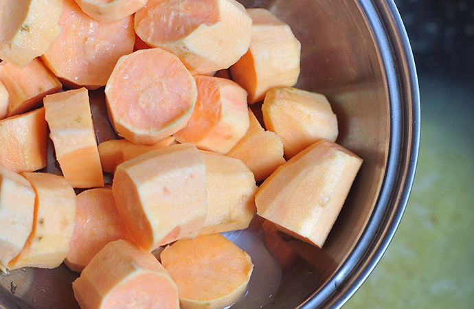 5、紅薯切小塊,放入燉鍋中,繼續熬煮20分鐘,米粥變稠,紅薯變軟后停止