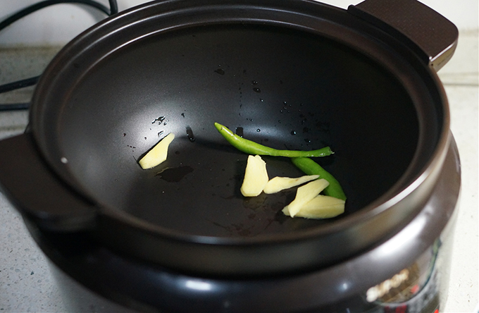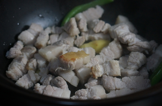 5、將五花肉下鍋,燜八分鐘,微出鍋
