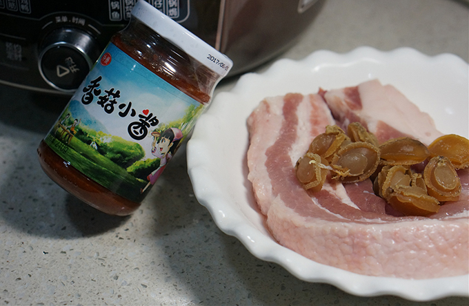 【主料】:五花肉700g、香菇醬3茶匙 【輔料】:鮑魚干適量、醬油適量、料酒3茶匙、辣椒半個、生姜1塊、蒜頭3個