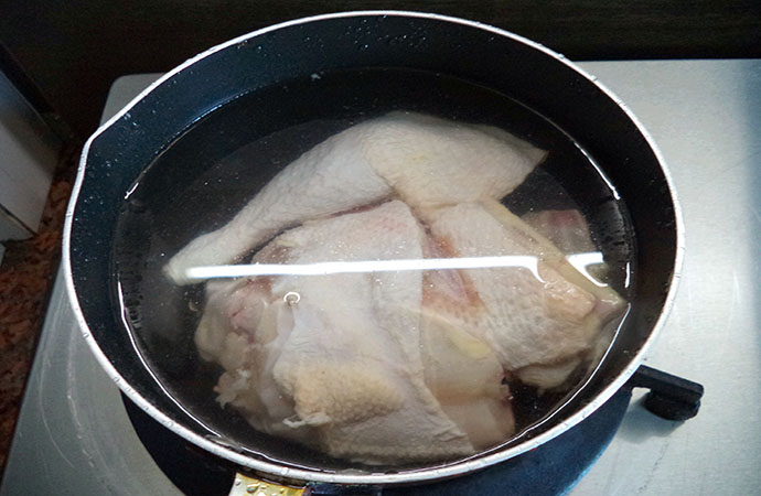 2.雞斬大塊冷水入鍋,開火,焯去血污