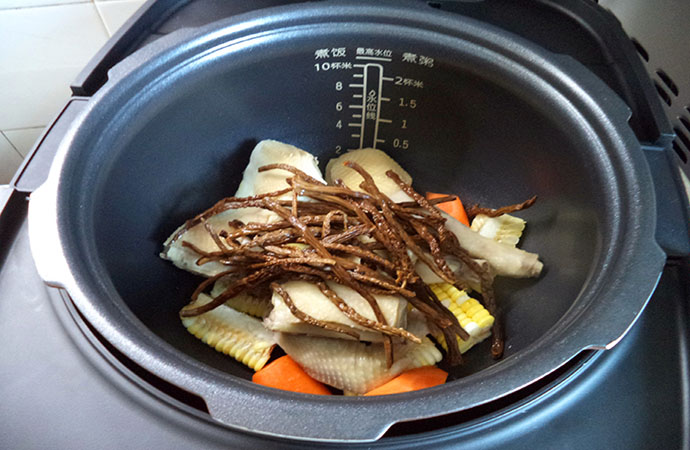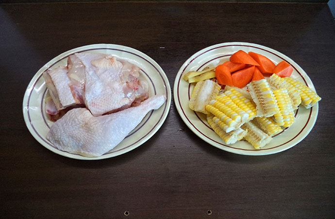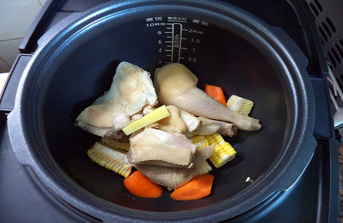 3.玉米與紅蘿卜入鍋,加入焯過水的雞塊