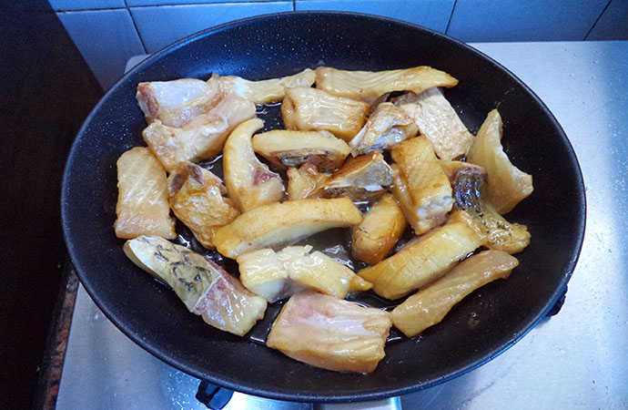 3.剩余的油繼續煎魚腩,也煎至兩面金黃后盛出