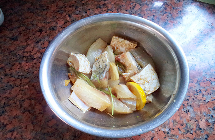 1.哈鯇魚魚腩洗凈切塊,加入鹽,糖,生抽,姜,香菜根,檸檬1片腌制10分鐘