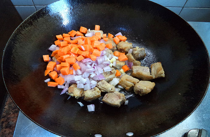4.加入大蒜,洋蔥與紅蘿卜炒勻