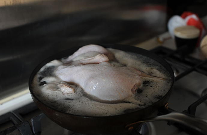 8. 水燒開后出現大量浮沫,撇走。加一次涼水,待再開鍋時出現少量雪白的浮沫就可以撈出鴨子了。沖洗干凈