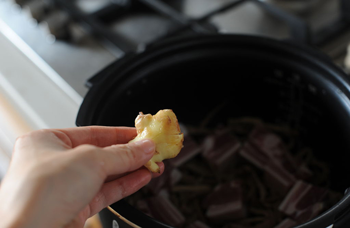 3.鍋里放涼水和一個兵乓球大小的生姜,放入鴨子,大火燒開讓鴨子汆一下水