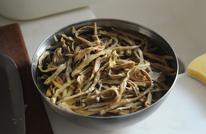 1. 燕筍干先淘洗干凈后清水浸泡隔夜。泡好后比較粗的就從根部撕成兩半或四半