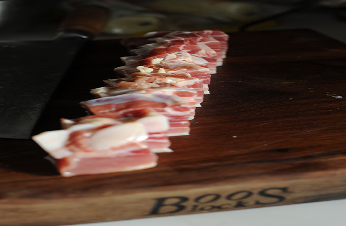 5. 在蘇泊爾鮮呼吸100壓力鍋的黑金球釜內膽中先鋪入泡好的筍干,然后排入咸肉