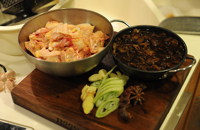 3. 榛蘑淘洗干凈后用清水浸泡20分鐘至半個小時。雞肉用一湯匙料酒抓勻。蔥姜切片,大蒜拍破,準備好大料和干辣椒