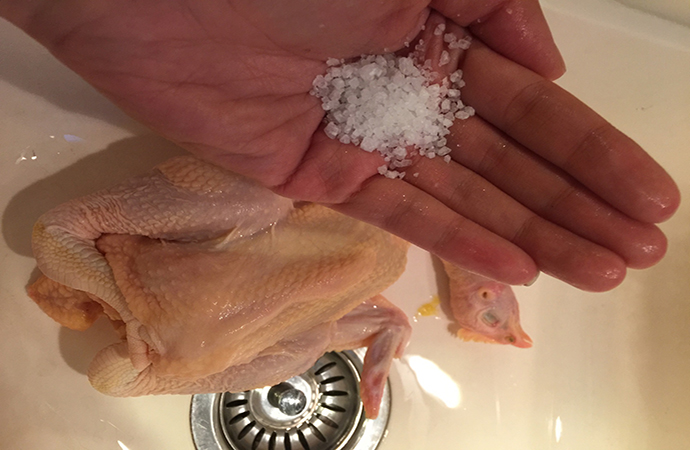 1. 用粗海鹽反復揉搓雞身,再用清水洗凈