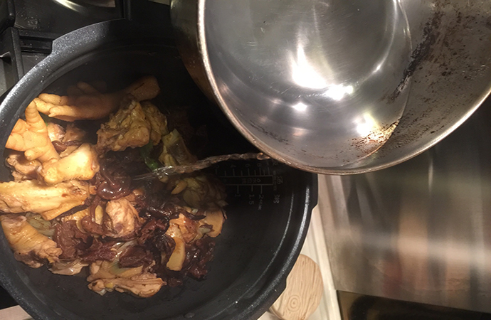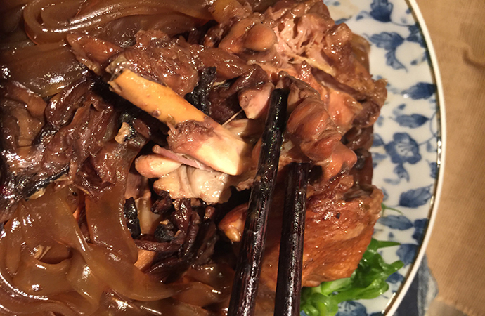 9. 開始收汁后放入寬粉和糖,一邊收汁一邊煮粉,收好汁粉也好了