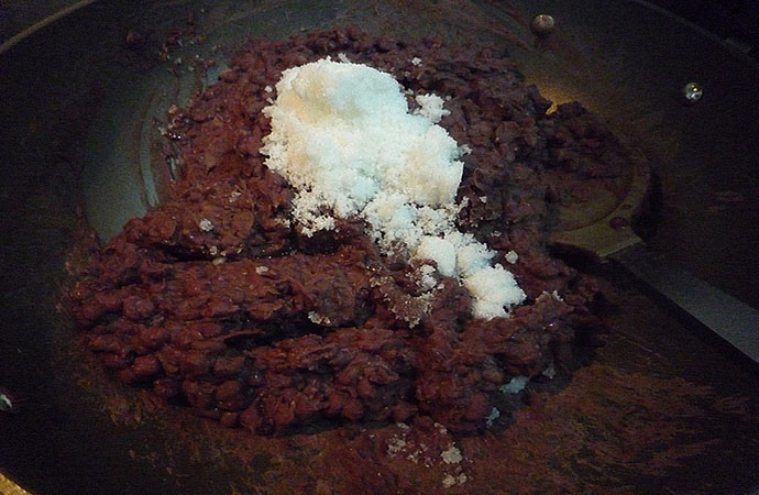 5. 翻炒出部分水汽后加入白糖,用小火炒到糖溶化炒到能站立即可