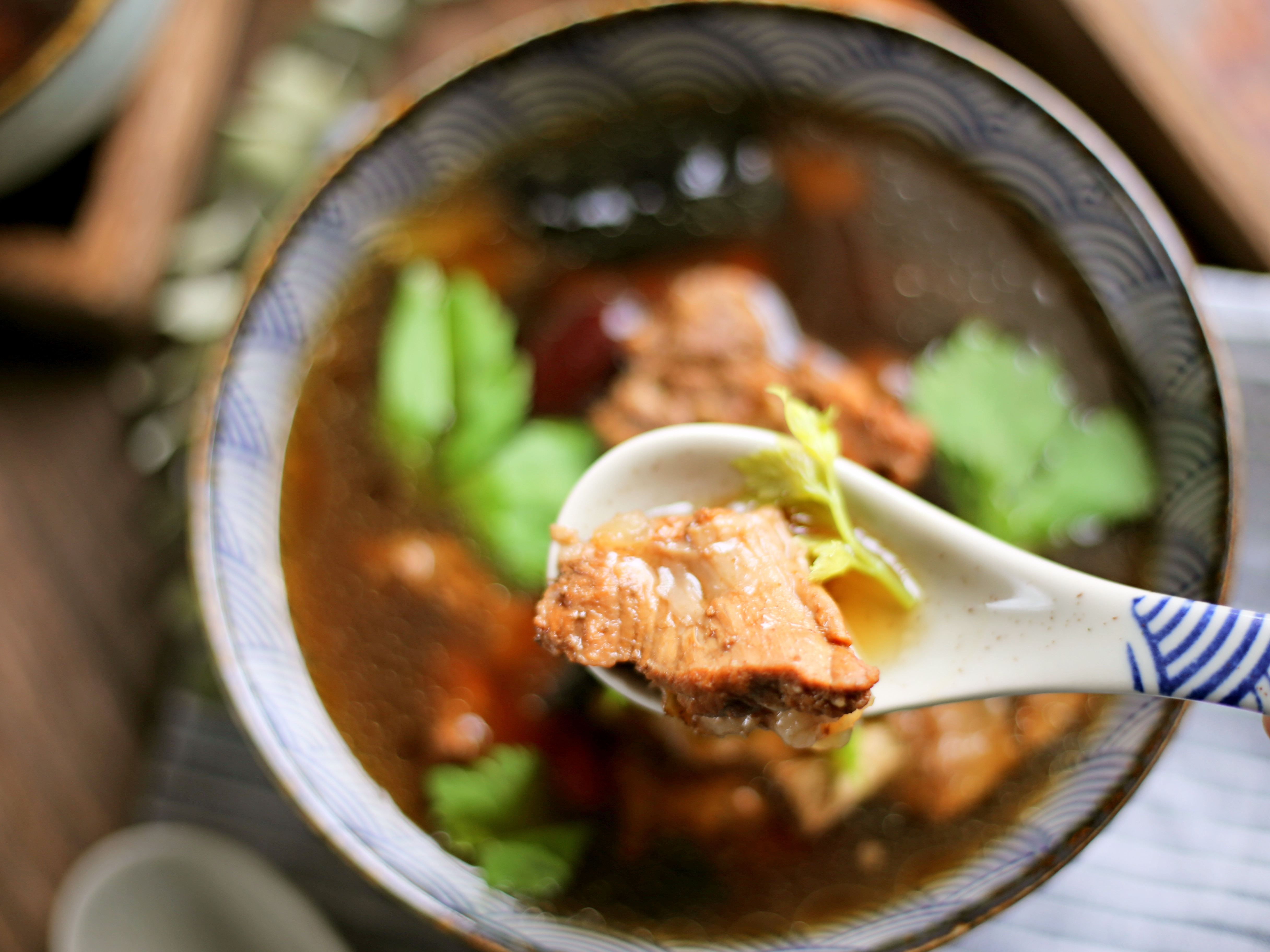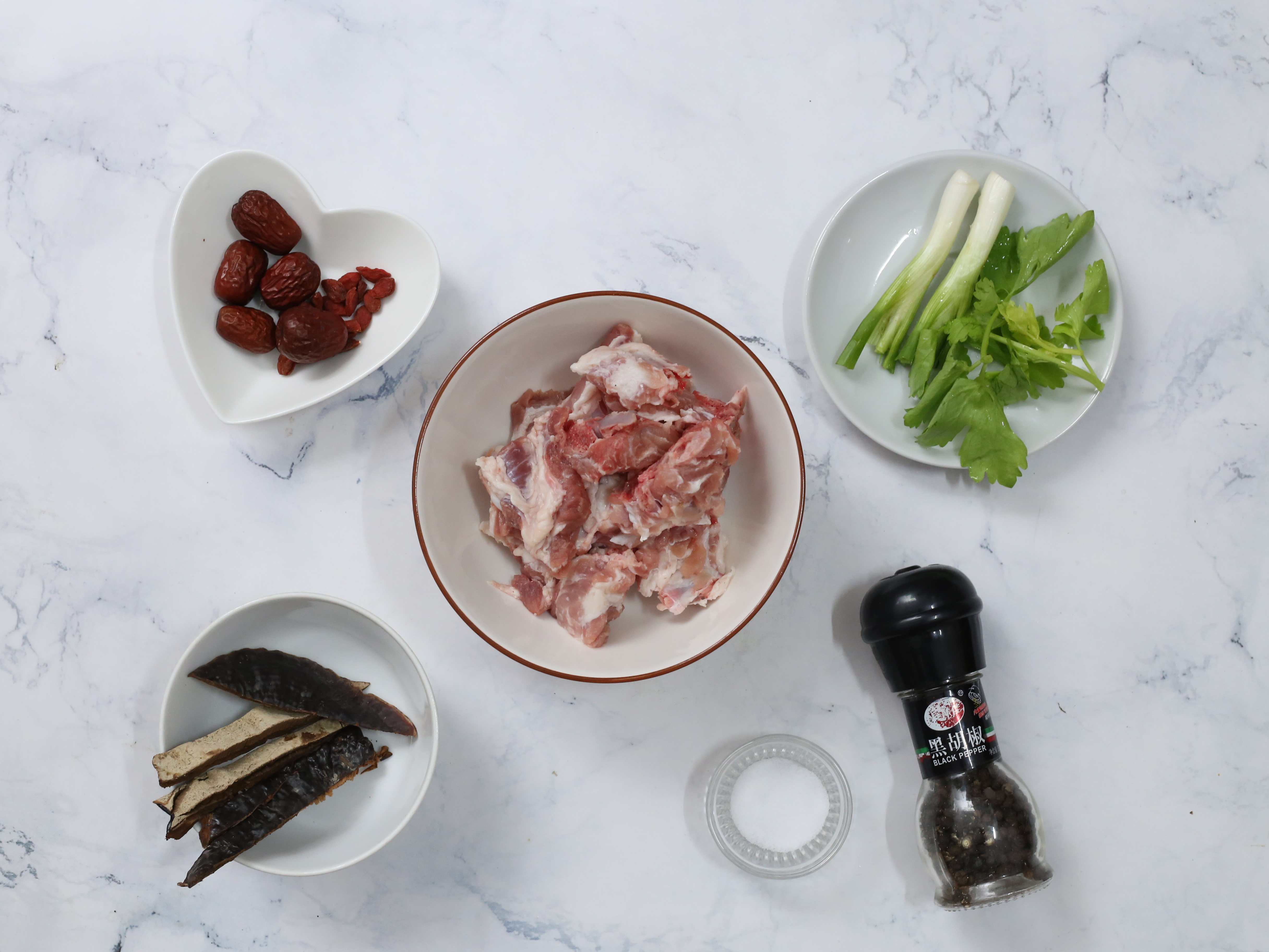 排骨300g,靈芝15g,紅棗5顆,枸杞5g,蔥頭適量,芹菜適量,鹽4g,黑胡椒適量