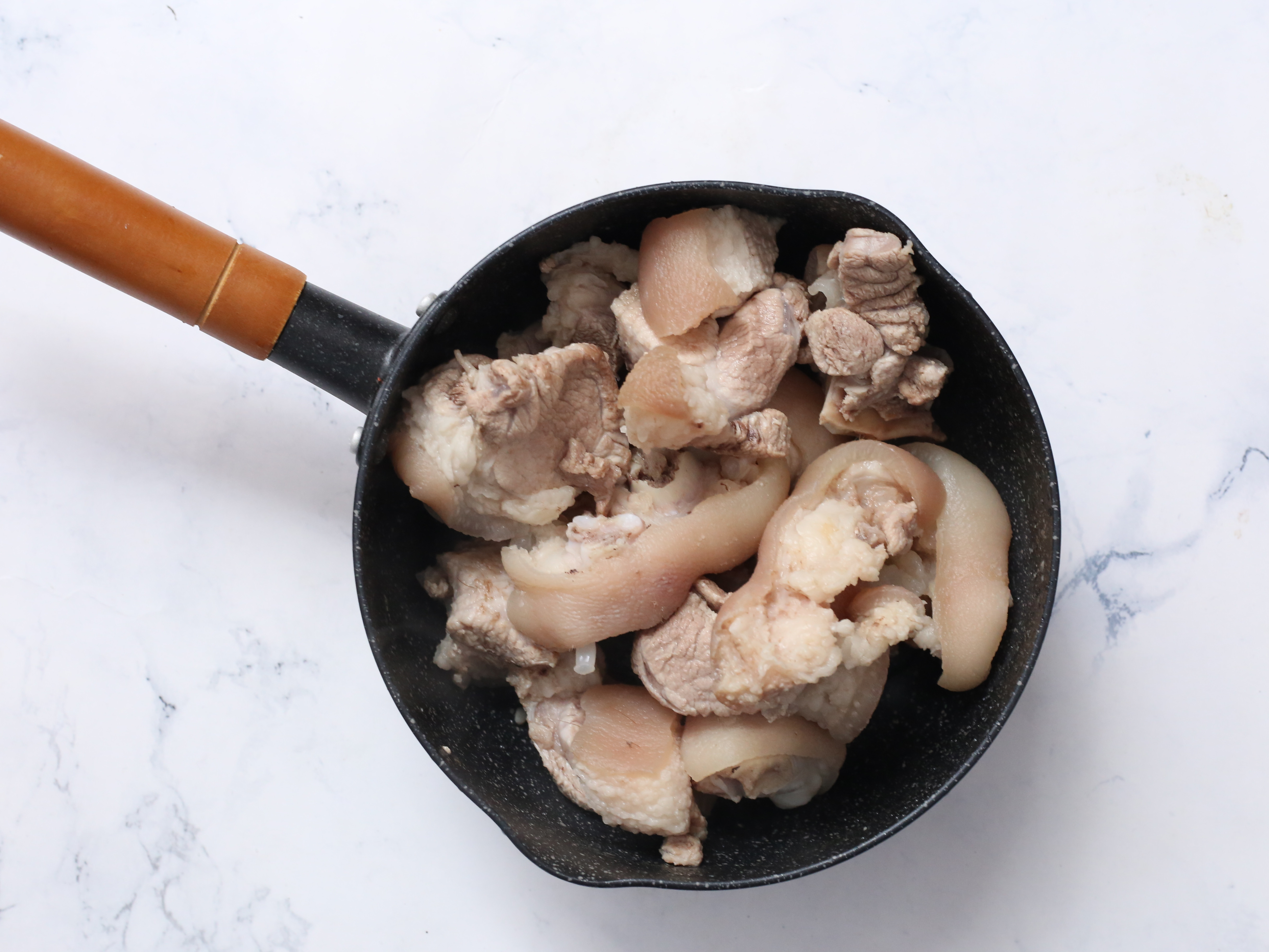 3.豬蹄洗干凈,冷水下鍋,大火燒開之后轉(zhuǎn)中火煮上4分鐘。