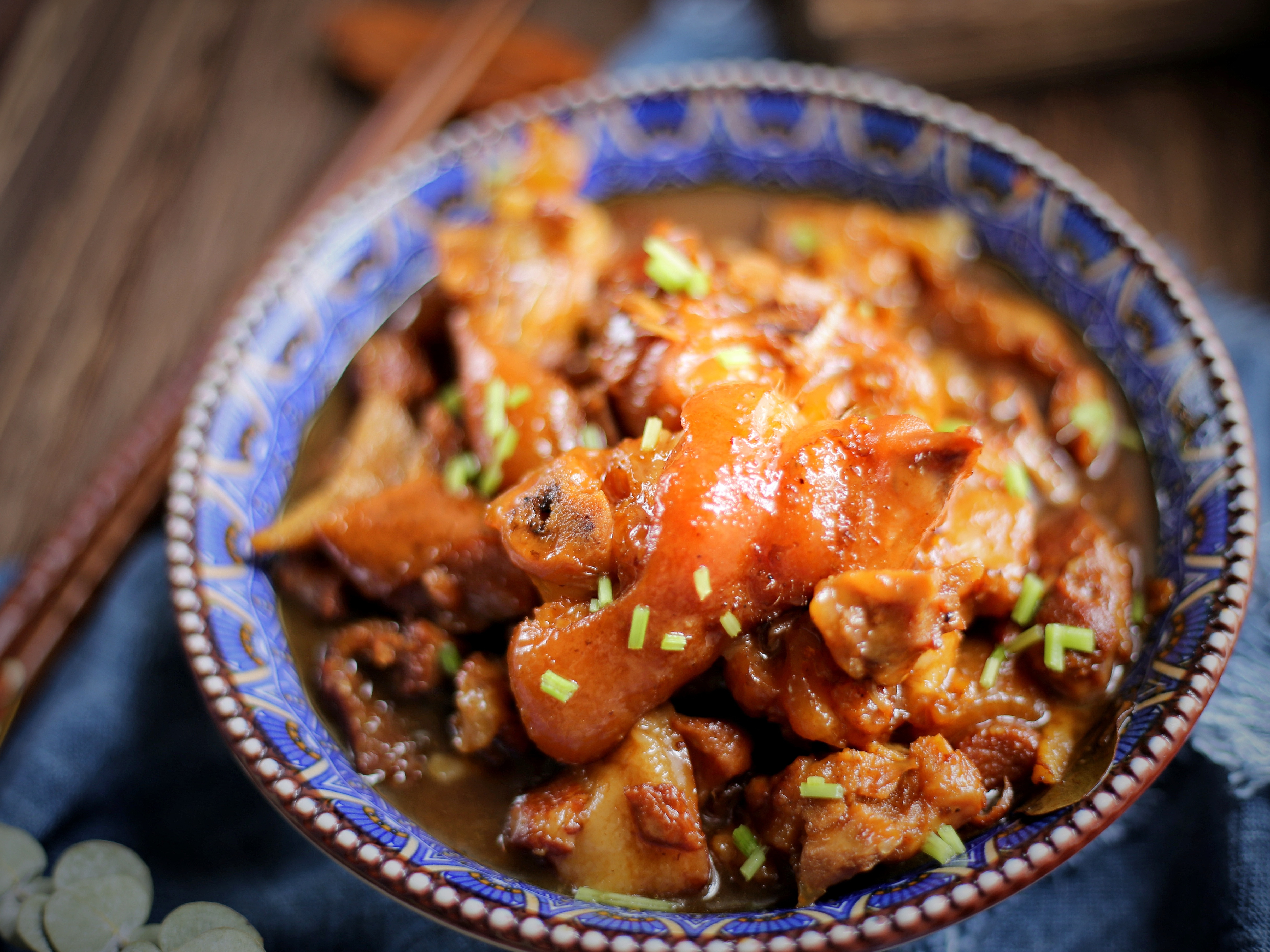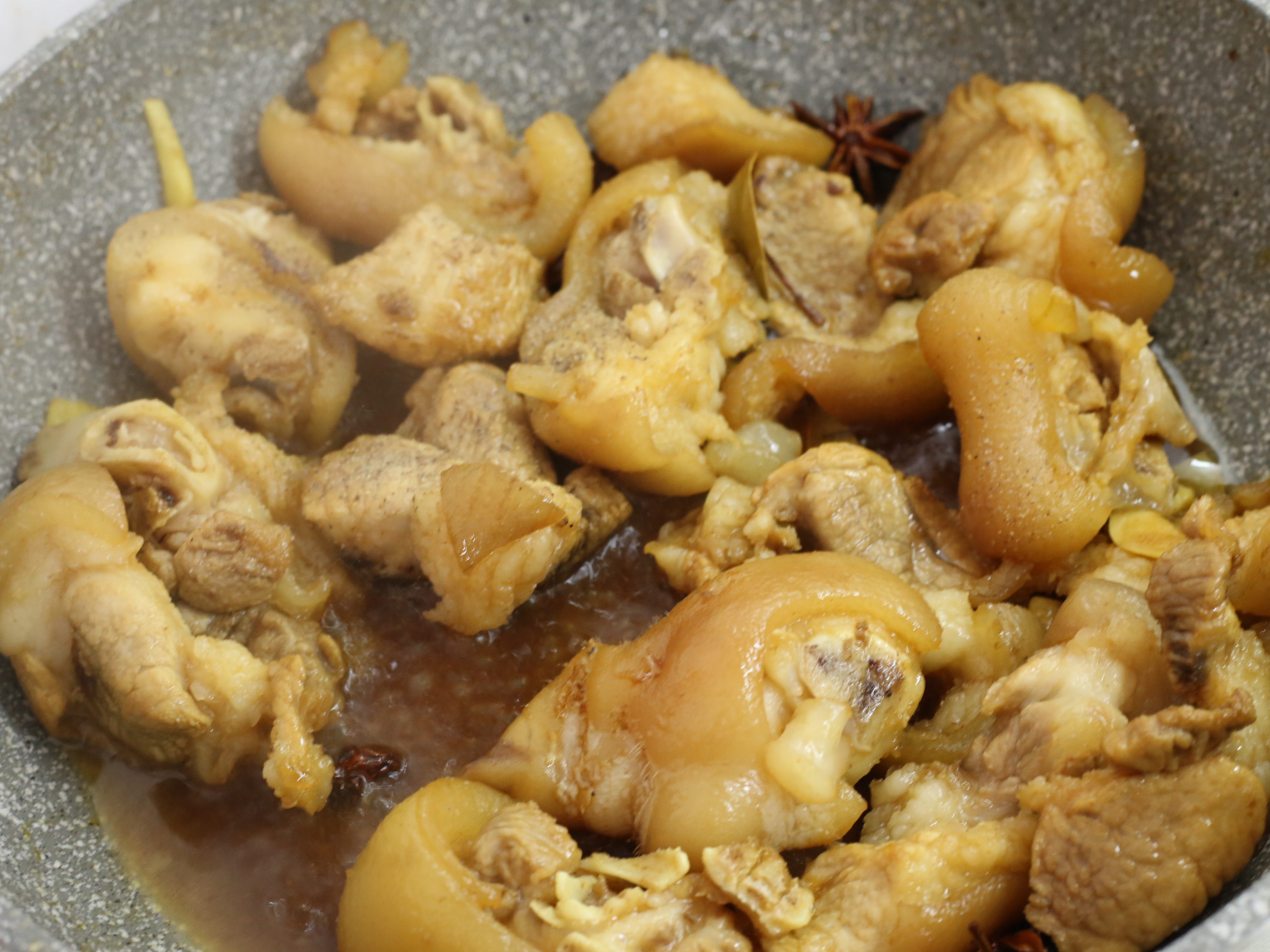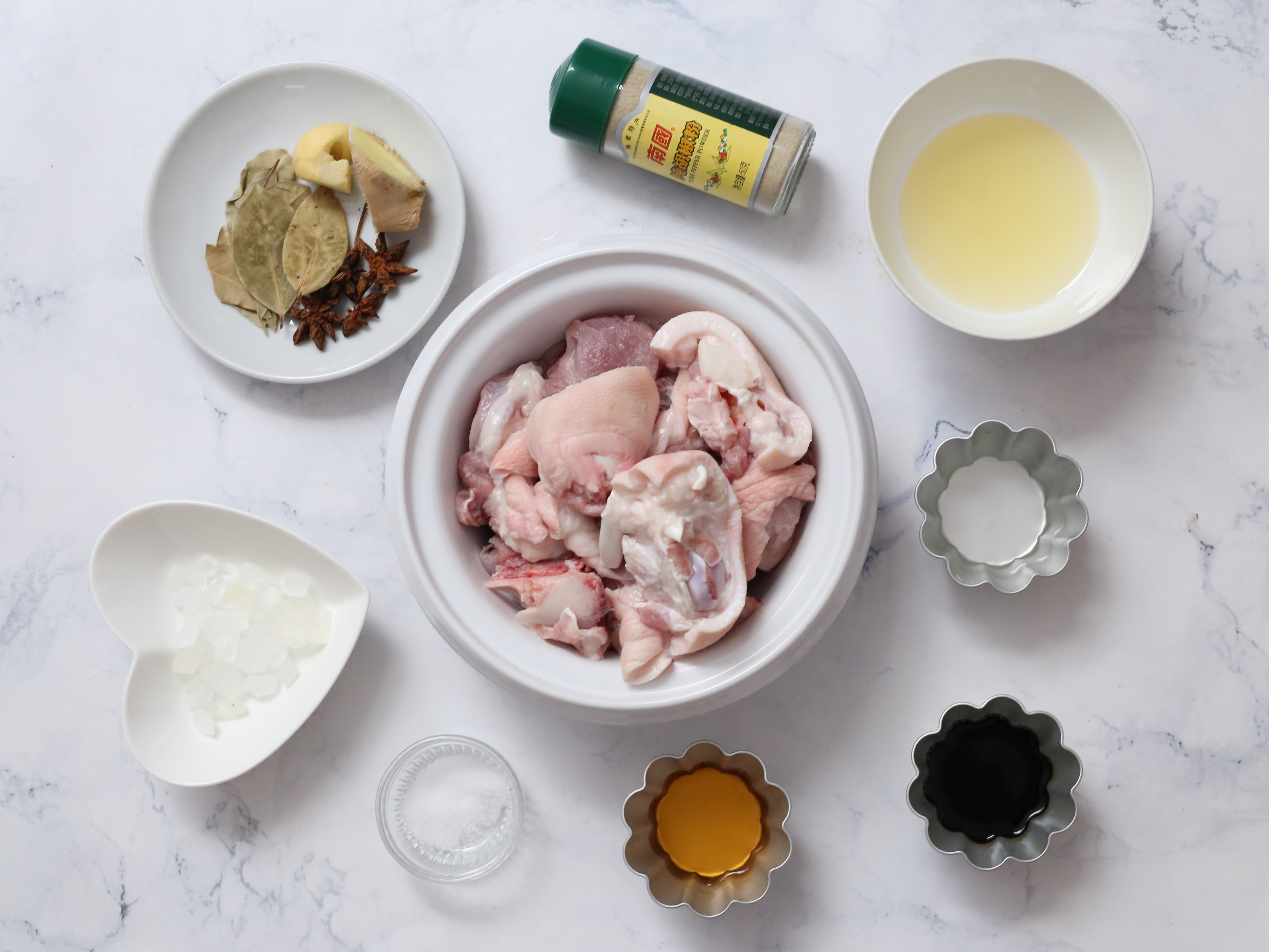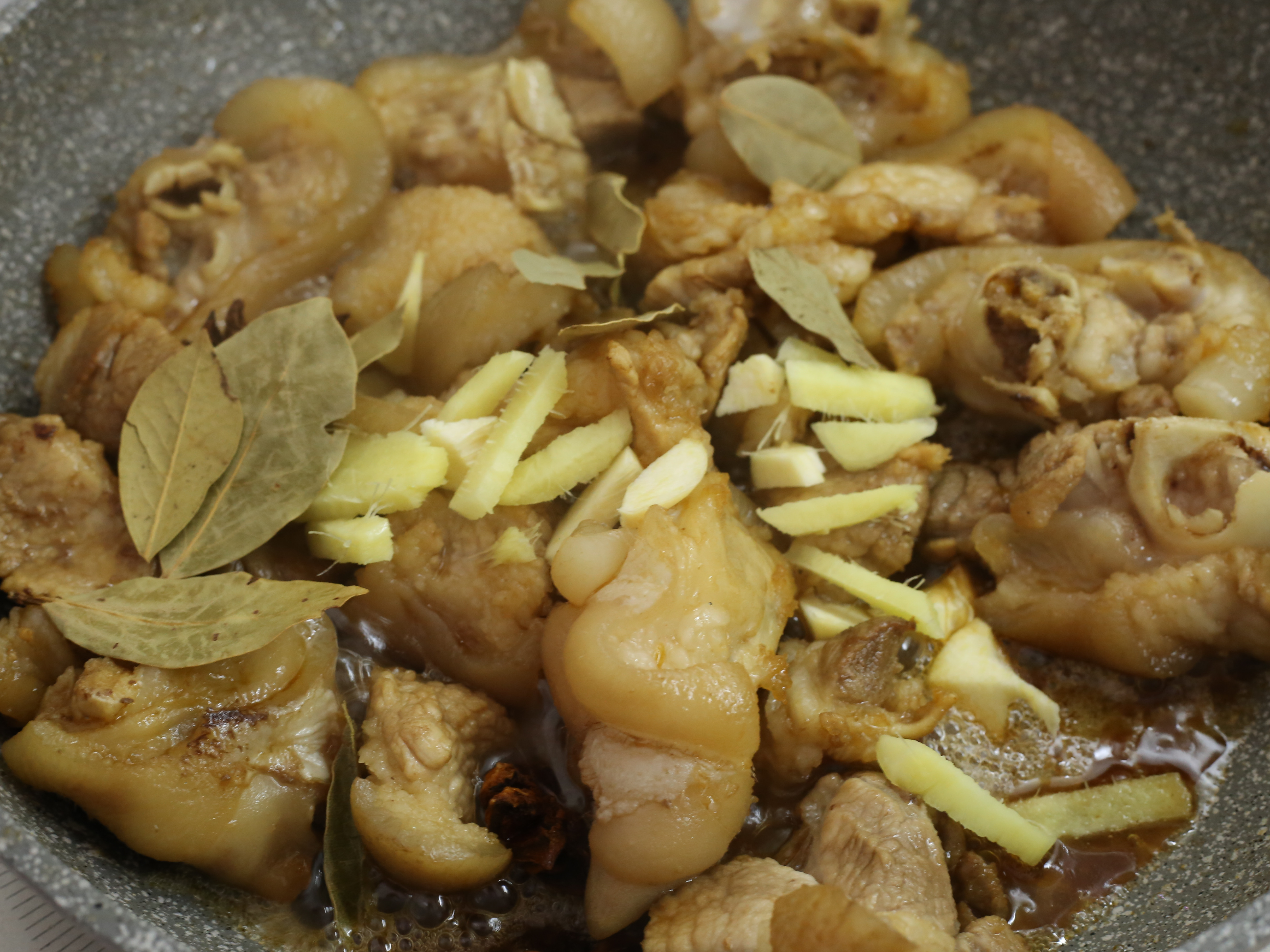 豬蹄750g、冰糖30g、油25g、料酒10g、生抽30g、鹽3g、陳皮2個(gè)、醋10g、白胡椒適量、香葉3葉、八角適量、姜適量、蒜頭適量