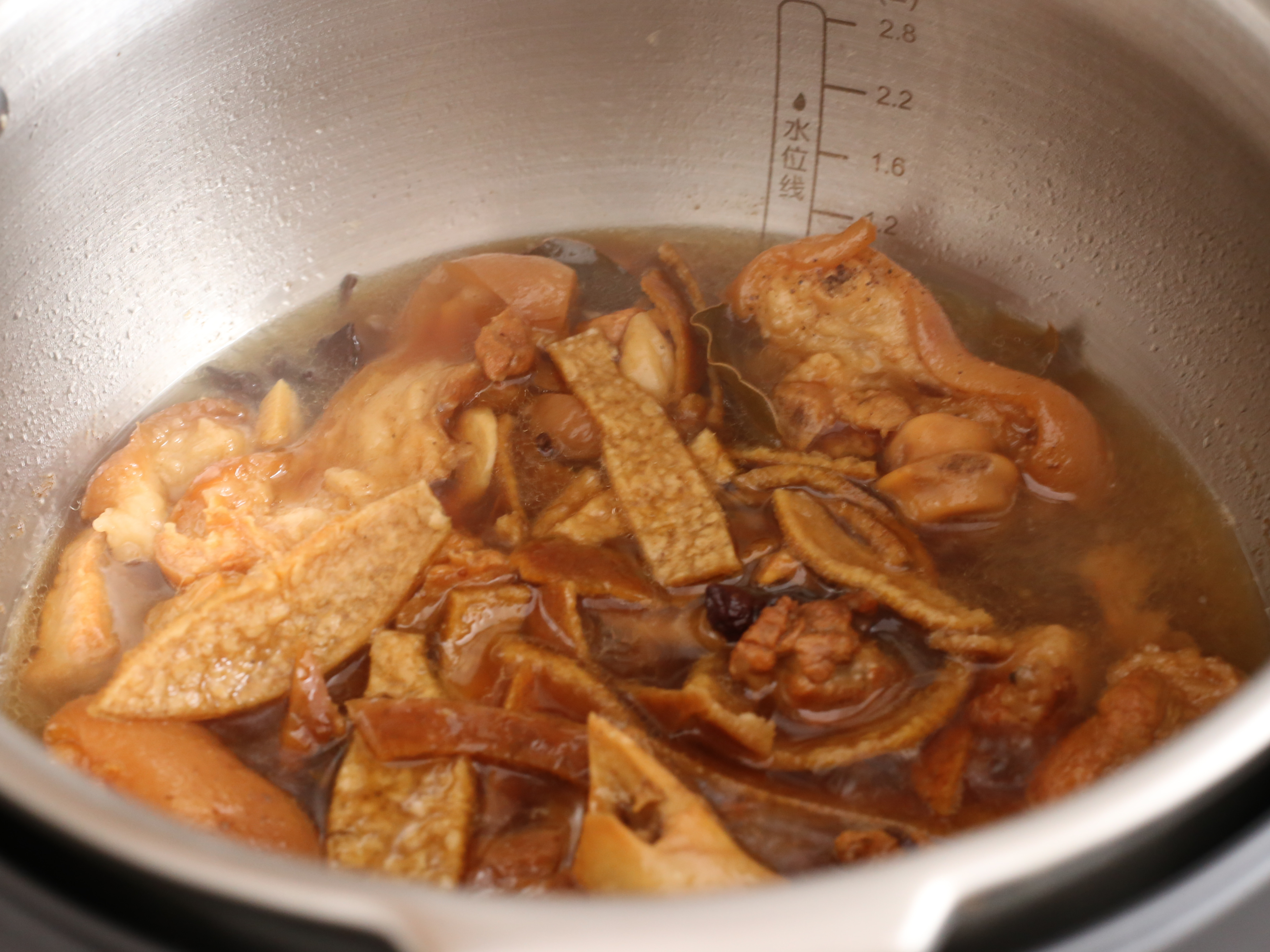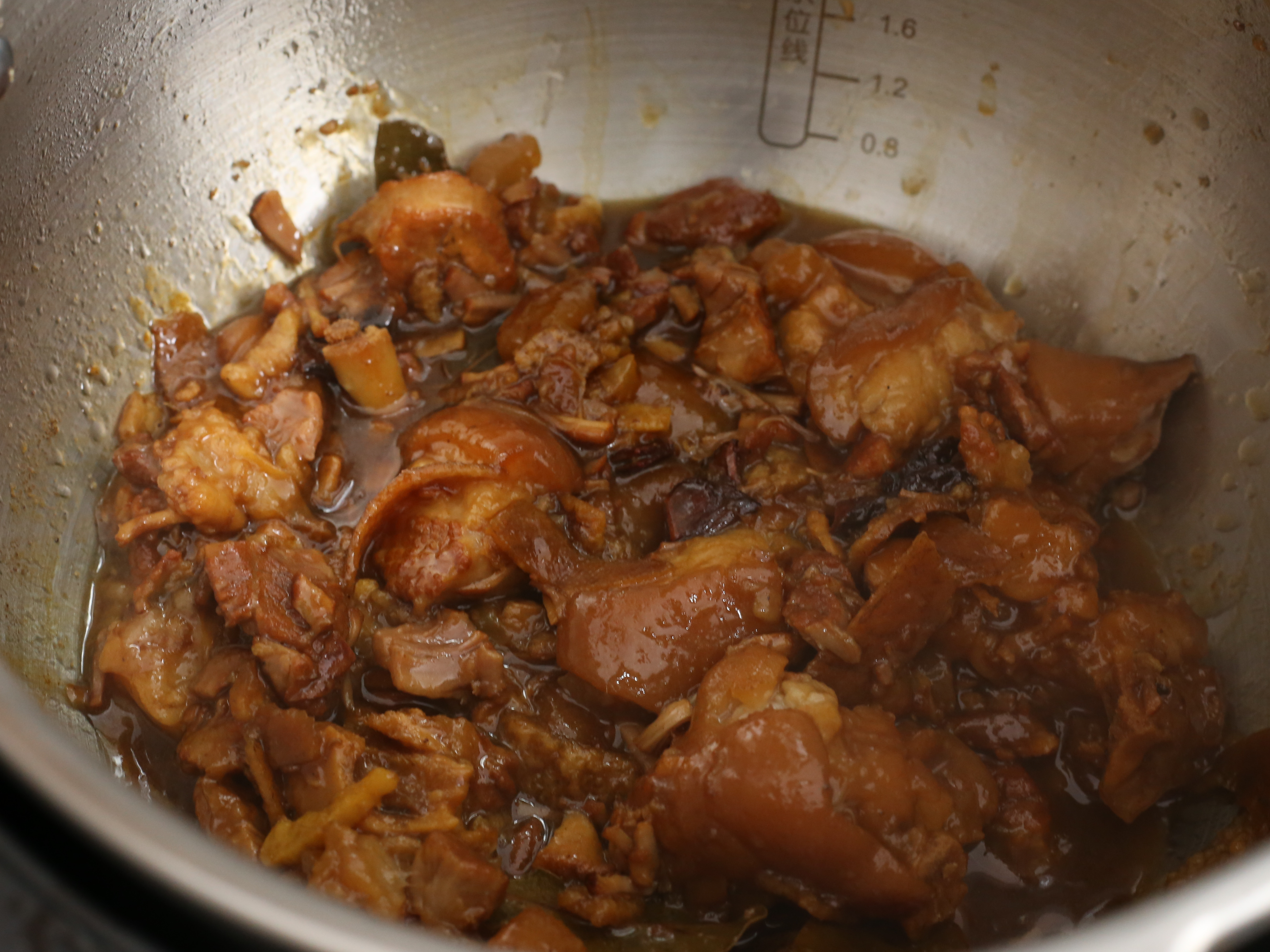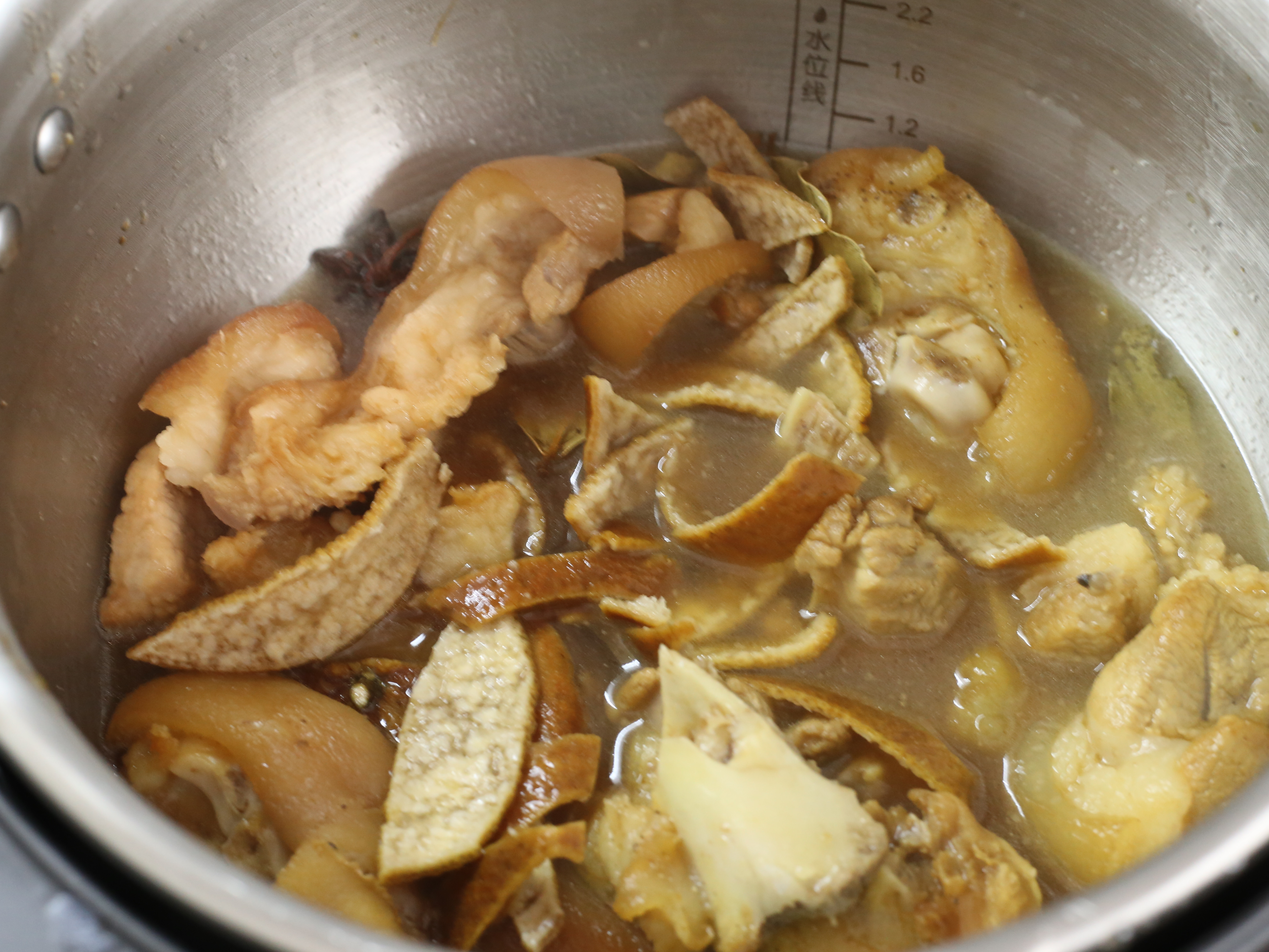 9.將豬蹄等倒入不銹鋼內(nèi)膽中,加入陳皮和陳皮水,水量接近沒過豬蹄即可,不要太多。