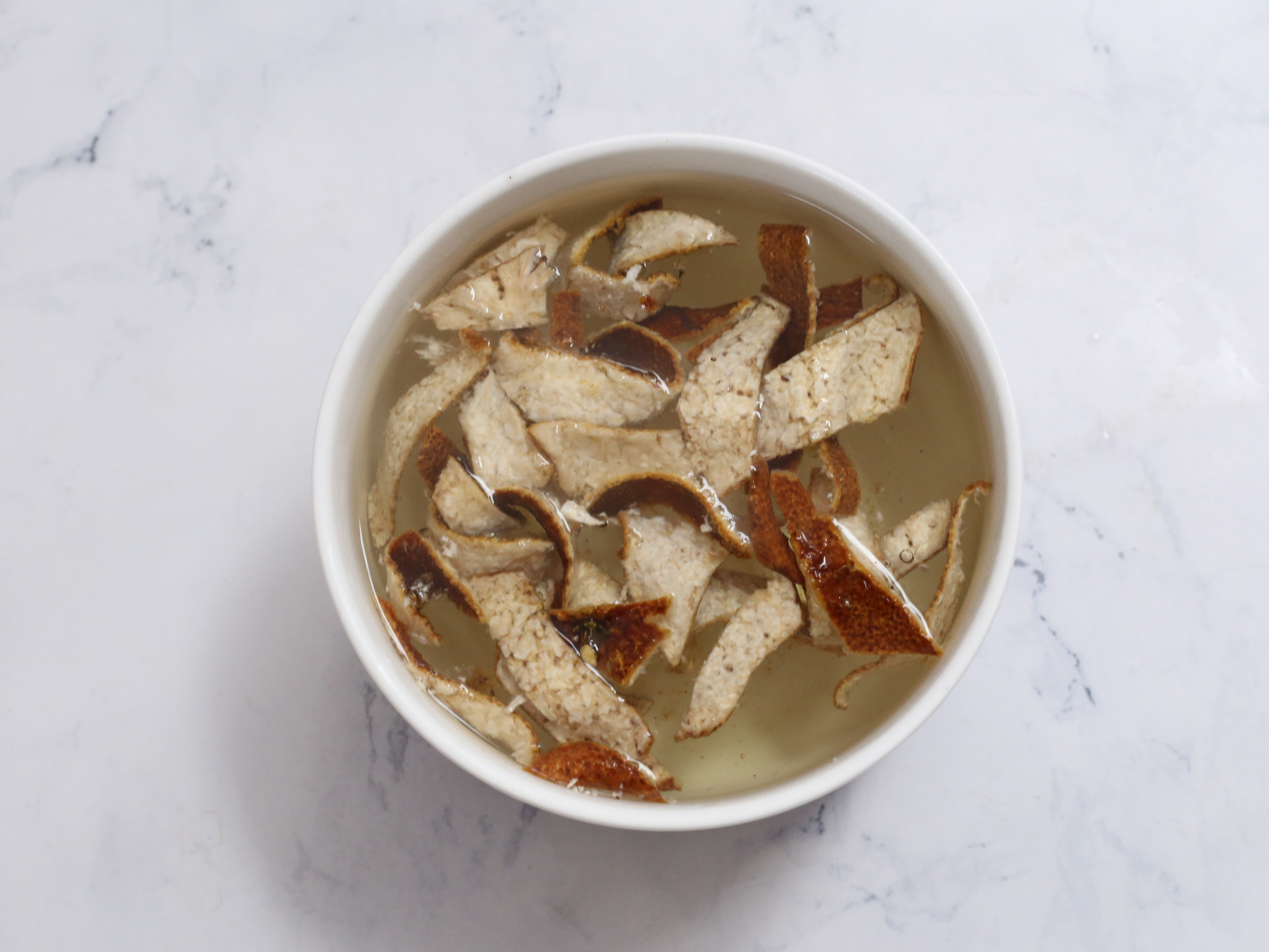 2.陳皮清洗一下之后用溫水浸泡1個(gè)小時(shí)以上。