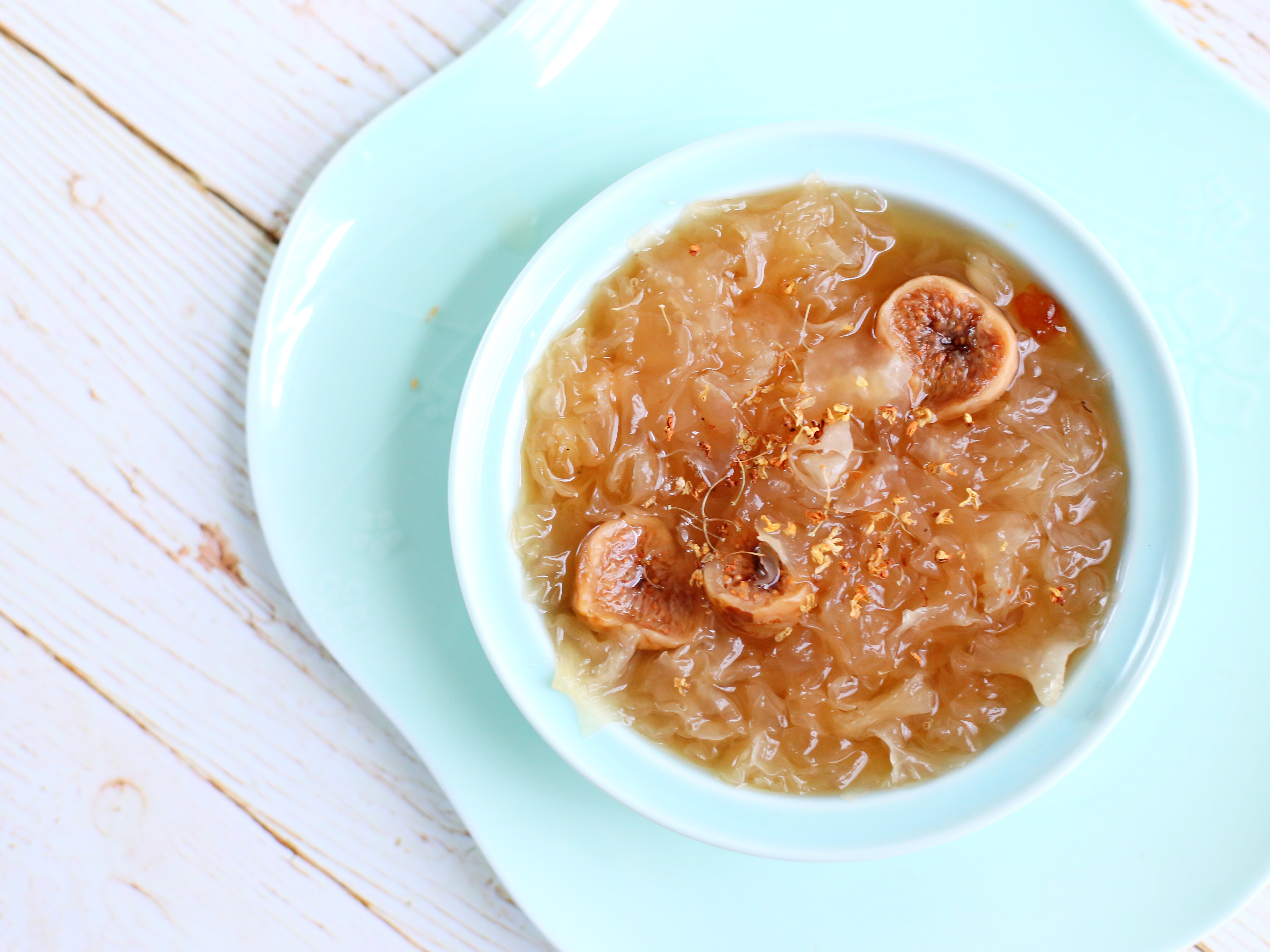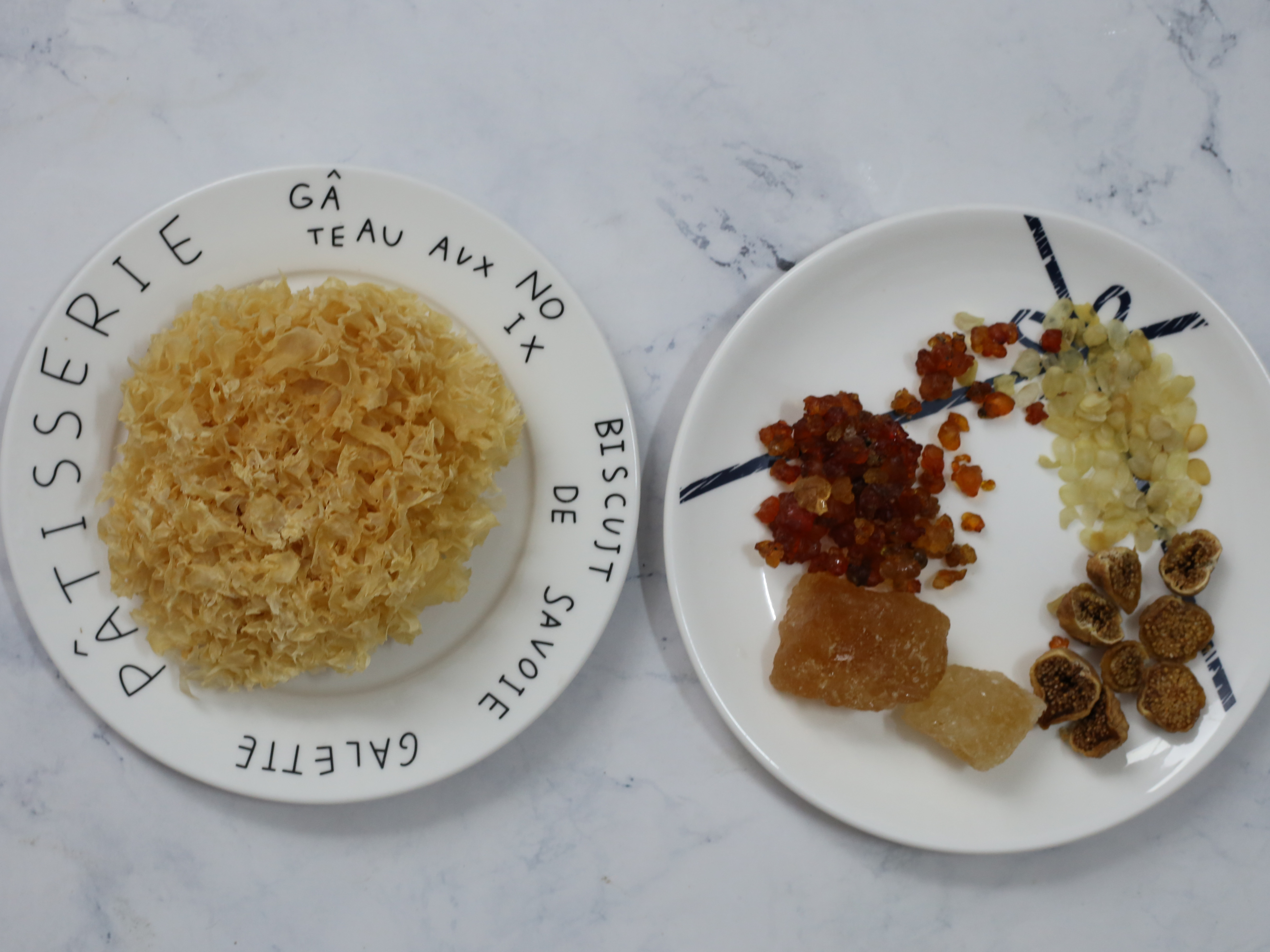 銀耳半朵、桃膠30g、雪蓮子15g、無花果干8個,黃冰糖2塊