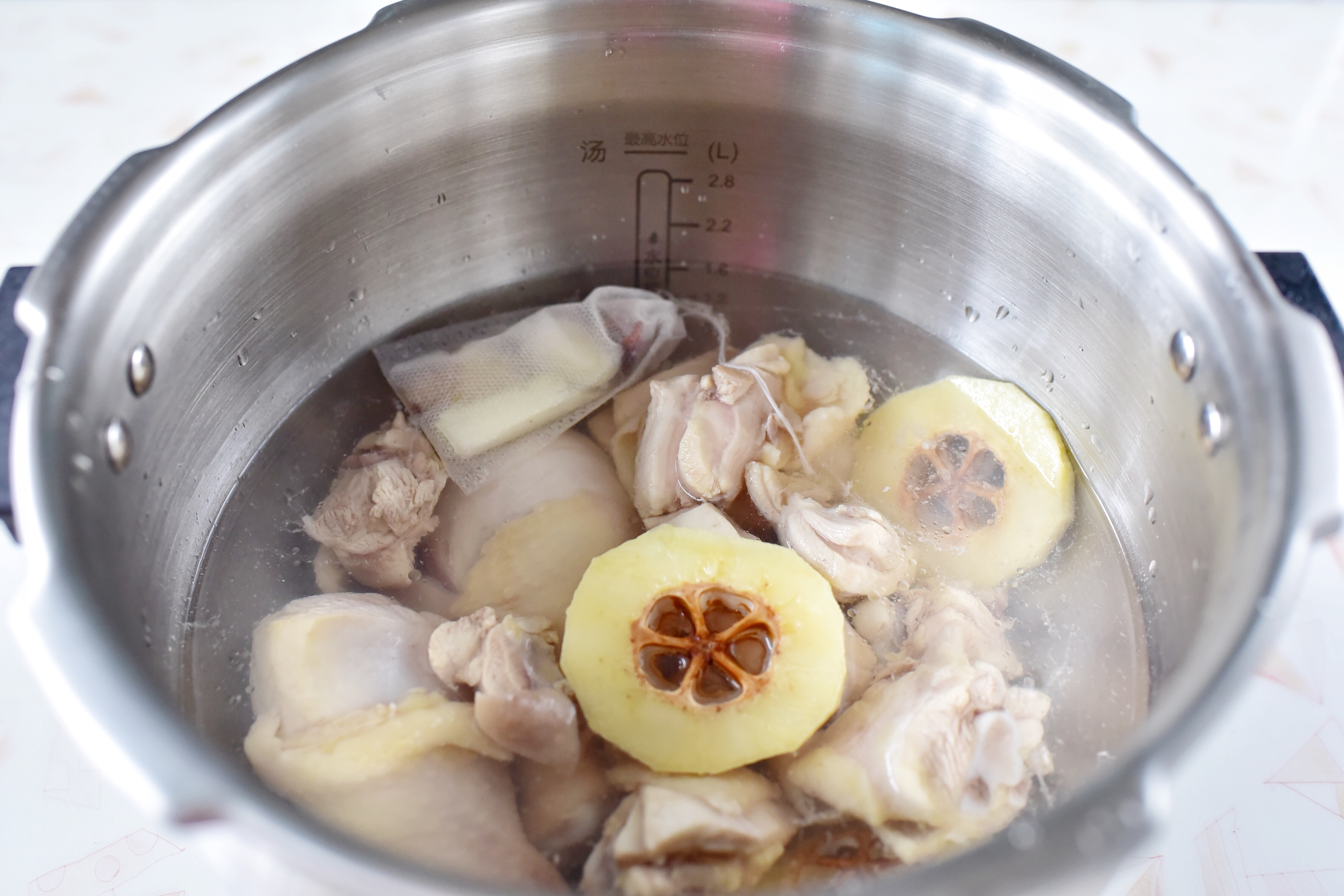 2雞腿、酸木瓜放入高壓鍋中,姜、花椒、八角放入料包中一同放入鍋內。