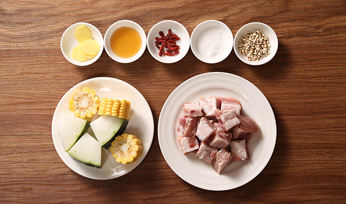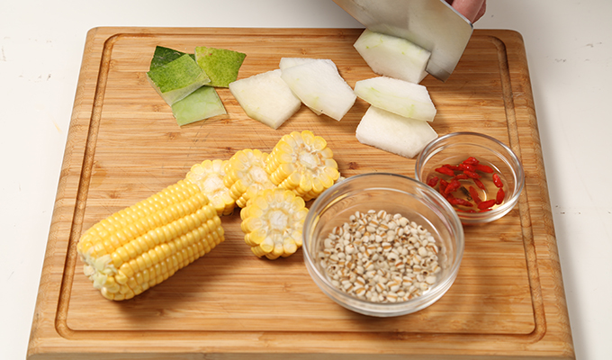 冬瓜去皮去籽切塊,玉米切段,薏米洗凈(溫水)浸泡20分鐘,枸杞洗凈,姜切絲備用。