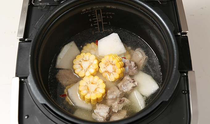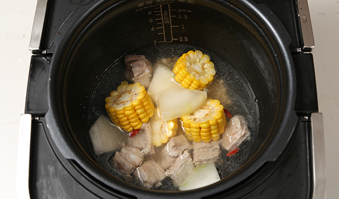 把冬瓜、排骨、玉米、薏米、姜絲、枸杞,放入壓力鍋中,加水,蓋上蓋子;煲湯。
