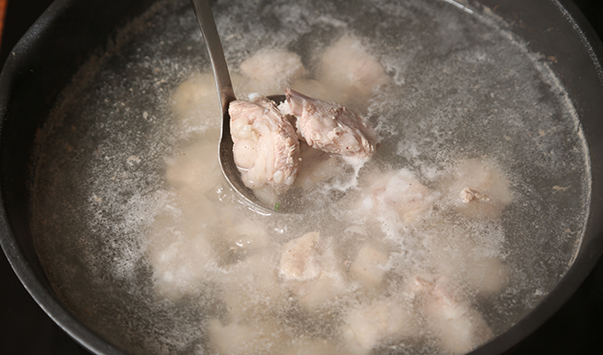 將排骨段(2.5厘米)、姜、料酒、水放入鍋中,焯水。