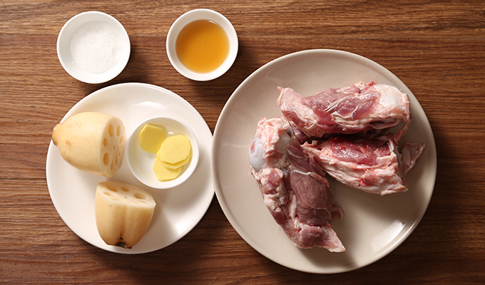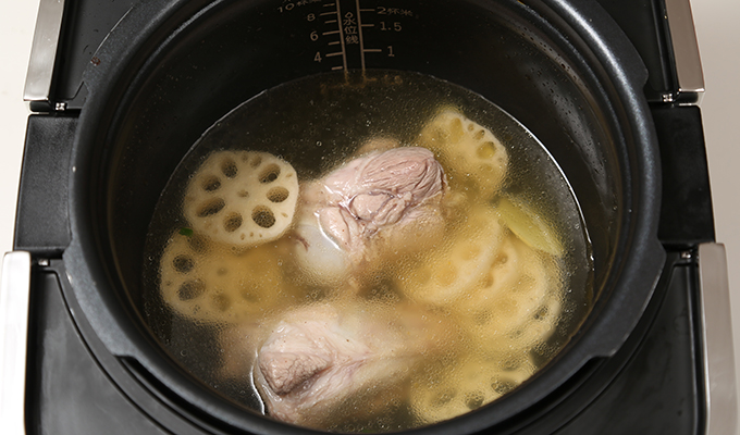 將豬骨、蓮藕、姜片、蔥段和水一起放進壓力鍋中,蓋上蓋子;煲湯。