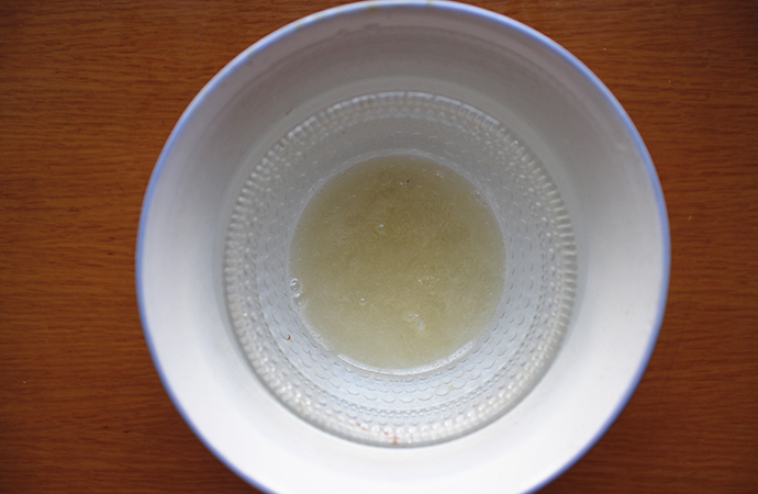 4、果汁榨好之后,將吉利丁片放在涼水里泡軟
