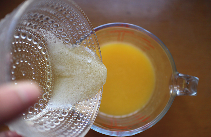 6、接著將融化成液態的吉利丁片倒入果汁中,然后徹底攪拌均勻