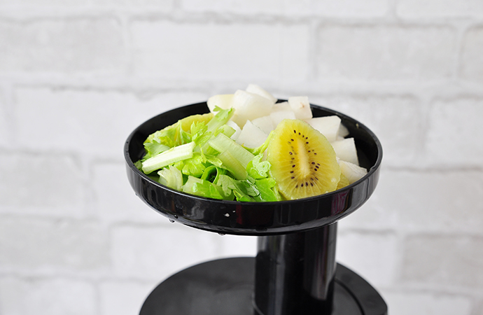 5、將切好的食材放在原汁機投料口處
