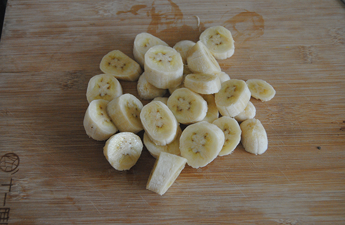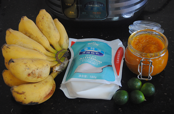 香蕉5個,酸奶250克,芒果醬適量,青橘1個