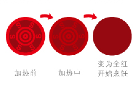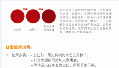 當鍋內溫度達到180度以上,鍋底字母會發生變化會接近一種顏色或完全消失,此時可以下菜,不會產生油煙;